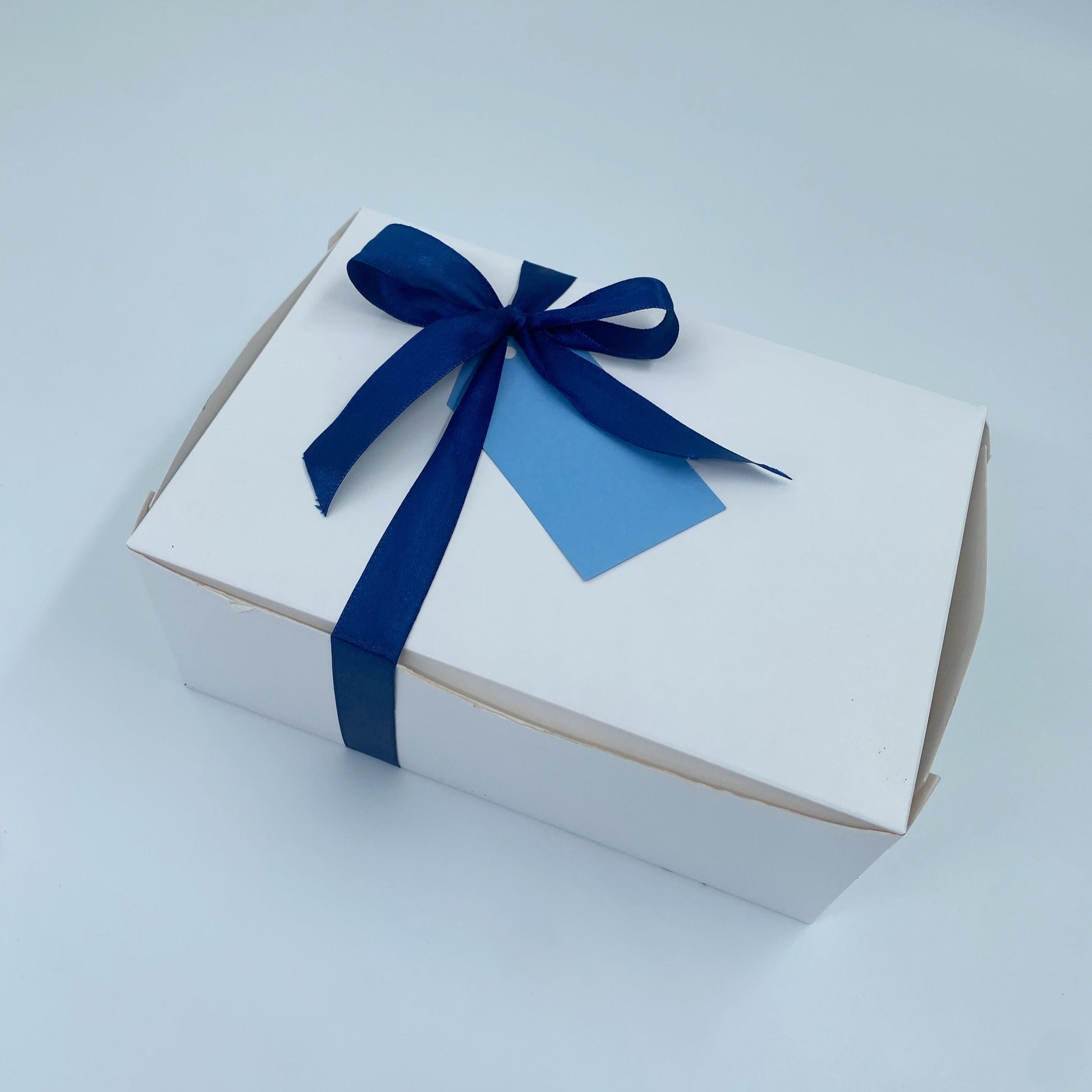 Each box comes wrapped in blue ribbon with a personalised gift tag.