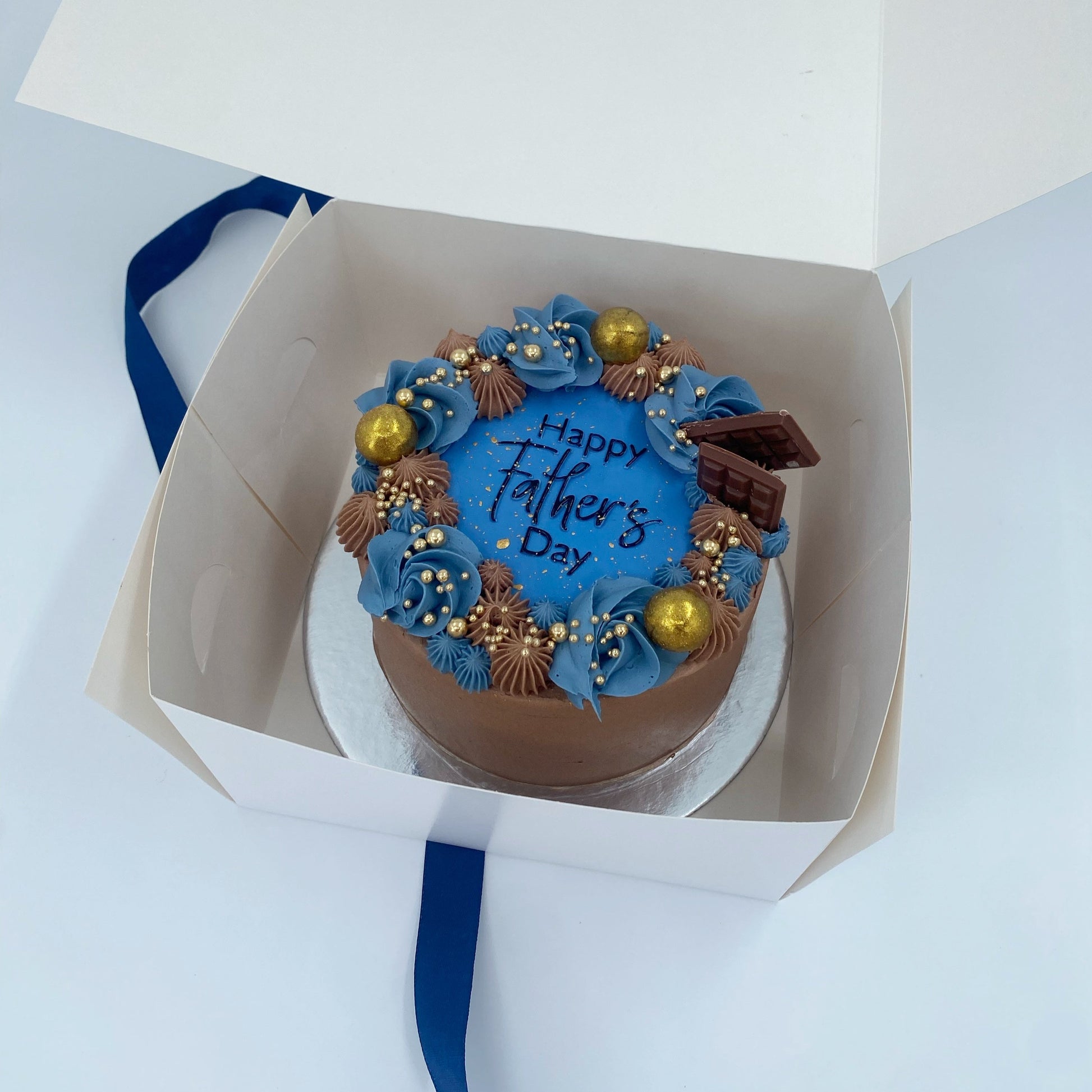 A mini 5 inch chocolate cake with a house made salted caramel filling, topped with a Father's Day fondant disc, delicate piping work, maltesers and sprinkles.